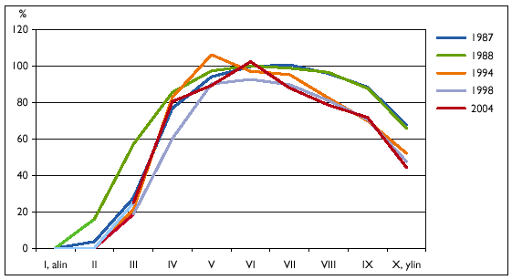 Kuvio 2. Kotitalouksien oman asunnon nettovarallisuusosuus prosenttia kokonaisvarallisuudesta varallisuusdesiileittäin 1987-2004