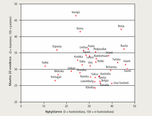 Artikkelin tilastolliset analyysit on tehty 30 OECD-maasta sekä neljästä Suomea lähellä olevasta maasta Virosta, Latviasta, Liettuasta ja Venäjästä. Kuvio 1 esittää nämä maat sirontakuviona siten, että vaaka-akselina on nykytilan hyvyys ja pystyakselina tulevaisuuden optimismi. Optimismia ei keskimäärin ole, sillä kaikkien maiden keskiarvot ovat alle 50. Venäjä ei ole tosin kaukana tästä eli maan koululaiset eivät ole erityisen huolissaan maansa ympäristön tulevaisuudesta. Sen sijaan venäläiset koululaiset kokivat suurta huolta nykytilanteesta.