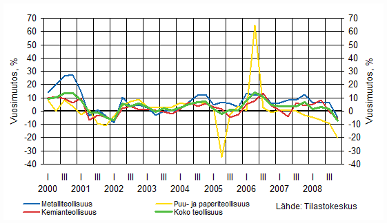 Suomen teollisuustuotannon jyrkkä alamäki alkoi viime vuoden lopulla. Tammikuussa teollisuustuotanto romahti. Myös kapasiteetin käyttöaste on ollut ennätyksellisen alhaalla eikä teollisuuden uudet tilaukset tuoneet tammikuussa valoa, vaan nekin laskivat peräti 40 prosenttia. Puu- ja paperiteollisuuden tuotanto on ollut lasku-uralla jo pidemmän aikaa, mutta loppuvuonna myös muut teollisuuden päätoimialat lähtivät laskuun.