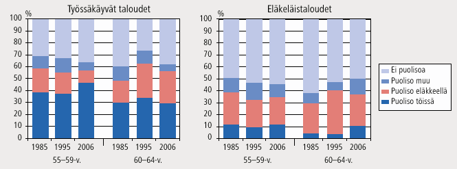 Osassa työssäkäyvien kotitalouksissa puoliso on siirtynyt jo eläkkeelle. Tämä on yleisempää 60 vuotta täyttäneillä tai sitä vanhemmilla erityisesti vuosina 1995 ja 2006, jolloin jo 40 prosenttia työssäkäyvien puolisoista oli siirtynyt eläkkeelle. Keskimäärin noin kymmenesosassa 55-64-vuotiaiden kotitalouksista puoliso on työelämän ulkopuolella työttömyyden tai vastaavan seurauksena. (Kuvio 1.)