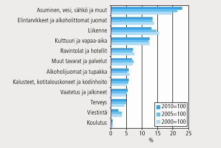 Asumismenot ovat lisääntyneet suhteellisesti eniten. Omistusasumisen, eritoten uusien asuntojen, ja sähkön osuus kokonaiskulutuksesta on kasvanut. Niiden hinnanmuutokset vaikuttavat siten aiempaa enemmän kuluttajahintaindeksin muutoksiin.