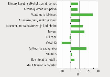 Kuviossa 2 on tarkasteltu yksityisen kulutuksen volyymin muutoksia vuodesta 2005 vuoteen 2010 kuluttajahintaindeksin pääryhmien mukaan vuoden 2010 hinnoin. Koska kuluttajahintaindeksi kuvaa puhdasta hinnanmuutosta, näkyy kuviossa myös laadun parantuminen volyymin kasvuna. Esimerkiksi voidaan ottaa tietokoneet ja olettaa, että niitä ostetaan edelleen yhtä monta kappaletta ja samaan hintaan kuin aiemmin. Koska tietokoneiden laatu on parantunut, niiden indeksi laskee ja tämä ilmenee määrän muutoksena.