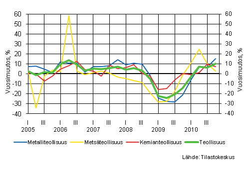 Kasvu jatkui kaikilla päätoimialoilla myös loppuvuonna. Kasvuvauhti tosin hidastui metsäteollisuudessa. Metsäteollisuuden tuotanto kasvoi loppuvuonna 3 prosenttia vuoden takaisesta. Tuotanto kasvoi metalliteollisuudessa noin 15 prosenttia ja kemianteollisuudessa runsaat 7 prosenttia.