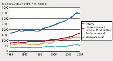 Kotitalouksien terveydenhoitomenot ovat lisääntyneet selvästi nopeammin kuin kulutusmenot keskimäärin. Kotitaloudet käyttivät vuonna 2009 terveydenhoitoonsa rahaa reaalisesti noin kaksinkertaisen määrän vuoteen 1985 verrattuna. Eniten lisääntyi avohoitopalveluihin käytetty rahamäärä ja vähiten sairaalapalvelut. (Kuvio.) Terveydenhoitomenojen osuus kaikista kulutusmenoista nousi vuoden 1985 2,6 prosentista 4,5 prosenttiin vuonna 2009. Lääke- ja sairaalapalveluiden osuus on pysynyt lähes ennallaan, mutta avohoitopalveluiden osuus kasvoi runsaassa 20 vuodessa vajaasta yhdestä kahteen prosenttiin. (Kansantalouden tilinpito, Tilastokeskus.)