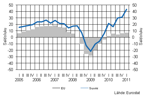 Eurostatin luottamusindikaattorin mukaan palvelualojen suhdannenäkymät EU-maissa pysyivät vakaina. Luottamusta kuvaava saldoluku voimistui hieman edellisestä neljänneksestä, ollen korkeimmillaan sitten toissa vuonna koetun taantuman. Suomessa palvelualojen luottamus vahvistui edelleen vuoden ensimmäisellä neljänneksellä ja on jo selvästi taantumaa edeltänyttä ajanjaksoa korkeammalla. Kysyntä on kehittynyt positiivisesti ja sen odotetaan jatkuvan myönteisenä. Työllisyystilanne on edelleen parantunut ja palvelualan työntekijöiden työllistymismahdollisuudet tulevina kuukausina ovat valoisat. Tuottajahintojen odotetaan yhä nousevan lähi kuukausien aikana.