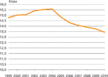 Kuvio 1. Kirjojen lainaus asukasta kohden 1999–2010