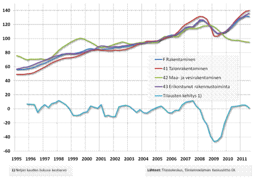 Odotuksia tulevasta suhdannekehityksestä painaa alas myös tuleva talvikausi. Rakentamisaktiviteetin heikkeneminen kausittain havaitaan myönnettyjen rakennuslupien sekä rakentamisaloitusten kausivaihteluna. Synkät odotukset – realisoituessaan – näkyvät viiveellä rakennustuotannon tilastoinnissa. Rakentamisen tuotanto vuoden 2011 kolmannella neljänneksellä on kokonaisuudessaan jatkunut myönteisenä, joskin liikevaihdon kasvuvauhti hidastui edelliseltä neljännekseltä. Tätä ennakoi EK:n rakentamisen suhdannebarometri jo suhteellisen varhain. Maa- ja vesirakentamisen liikevaihto kasvoi edeltävään vuoteen nähden pitkästä aikaa selvästi. Liikevaihdon kasvu selittyy pääosin hintojen nousulla, mikä ilmenee tarkasteltaessa rakentamisen määrän kehitystä.