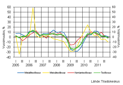 Teollisuustuotanto (C TOL 2008) kasvoi viime vuonna 2 prosenttia. Teollisuustuotanto on kasvanut pari vuotta vuoden 2009 finanssikriisin jälkeen, kuitenkin viime vuoden lopulla tuotanto kääntyi jälleen laskuun. Teollisuuden (C TOL 2008) tuotanto väheni neljännellä neljänneksellä 1,4 prosenttia vuoden takaisesta. Vuoden 2011 lopulla alkanut tuotannon väheneminen jatkui tammikuussa, jolloin tuotanto laski 2,1 prosenttia vuoden takaiseen verrattuna.