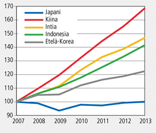 Kuvio 1. Eräiden Aasian maiden bruttokansantuotteen volyymi vuosina 2007–2013. 2007=100.