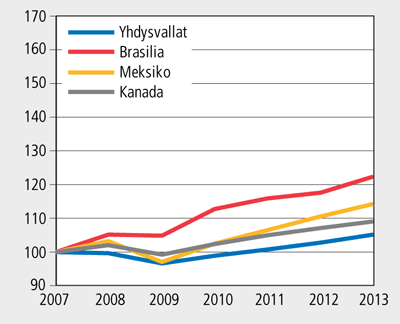 Kuvio 2. Eräiden Etelä- ja Pohjois-Amerikan maiden bruttokansantuotteen volyymi vuosina 2007–2013. 2007=100.