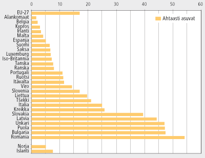 Kuten oheisesta kuviosta käy ilmi, suomalaisten asumistaso on eurooppalaisittain hyvä. Tässä artikkelissa keskityn ahtaasti asumiseen, joka heikentää yhä merkittävästi kotitalouksien asumistasoa (Reijo 2007; Tiihonen 2008). Käytän tarkastelussani myös tuloksia tutkimuskysymyksestä, jolla on selvitetty henkilöiden (EU-SILCin kotitalousosaan vastaavat henkilöt) omaa mielipidettä asuntonsa ahtaudesta.