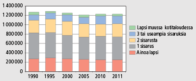 Lapsiperheiden lisäksi lasten lukumäärä on vähentynyt, muttei yhtä paljon. Lapsiperheiden keskimääräinen lapsiluku onkin hieman kasvanut ja yhä useammalla lapsella on enemmän kuin yksi sisarus perheessä. 1990-luvun alussa ydinperheissä asuvista lapsista 68 prosentilla oli yksi sisarus tai ei yhtään, vuonna 2011 osuus oli 62 prosenttia. Erityisesti on kasvanut niiden lasten osuus, joilla sisaruksia on 3 tai enemmän: vuonna 1990 heitä oli 9 prosenttia ja vuonna 2011 14 prosenttia kaikista lapsista. (Kuvio 1.)