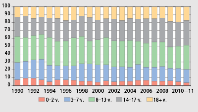 Huoltajien ja sisarusten määrän lisäksi lasten ja lapsiperheiden toimeentuloon vaikuttaa lasten ikärakenne, joka on muuttunut erityisesti yhden huoltajan talouksissa merkittävästi. Yhden huoltajan lapset olleet yleensä vanhempia kuin kahden huoltajan lapset, sillä eron sattuessa lapset ovat jo usein varttuneita. 1990-luvun alusta yhden huoltajan kanssa asuvien lasten ikärakenne on kuitenkin muuttunut niin, että alle 8-vuotiaiden lasten osuus on pienentynyt 30 prosentista 20:een ja 14 vuotta täyttäneiden on kasvanut alle 40 prosentista 50 prosenttiin. Tässä tarkastelussa mukana oleva 18–24-vuotiaiden lasten ryhmä on myös kasvattanut osuuttaan. (Kuvio 2a.)