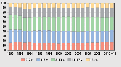 Kuvio 2b. Lasten ikärakenne kahden huoltajan perheissä vuosina 1990–2011*. Prosenttia.