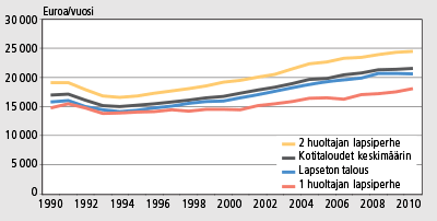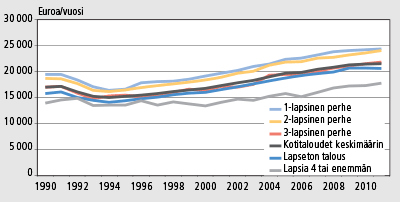Sekä yhden että kahden huoltajan talouksien keskimääräinen lapsiluku on kasvanut, mutta erityisen selvästi on kasvanut yhden huoltajan talouksissa asuvien lasten määrä: vuonna 1990 yhden huoltajan talouksissa oli keskimäärin 1,42 lasta, vuonna 2011 lapsia oli keskimäärin 1,66. Kahden huoltajan talouksissa määrä on kasvanut vähemmän, 1,88:stä 1,94:een. Lapsiluvun kasvu on tärkeää pitää mielessä kun tarkastellaan, miten perheiden tulot ovat kehittyneet.