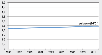 Palkkarakennetilastosta lasketut palkansaajien palkkaerot ovat pysyneet vuodesta 1995 asti lähes samalla tasolla. Vuonna 1995 palkansaajien parhaiten palkattu kymmenesosa ansaitsi 2,2 kertaa enemmän kuin heikoiten palkattu kymmenesosa. Vuonna 2012 vastaava suhdeluku oli 2,4 (kuvio 1).