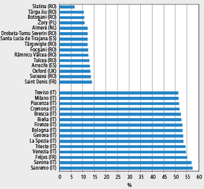 EU:n kaupunki-indikaattorien 900:sta kaupungista 115 oli sellaisia, joissa vanhushuoltosuhteen arvo oli vuonna 2011 alle 20 prosenttia. Alhaisen huoltosuhteen kaupunkeja löytyi eri puolilta Eurooppaa. Eniten tällaisia kaupunkeja oli Romaniassa, Isossa-Britanniassa ja Puolassa. 62 kaupungissa huoltosuhteen arvo oli yli 40 prosenttia. Yhdeksän 15 alhaisimman huoltosuhteen kaupungista sijaitsi Romaniassa. Yhtä lukuun ottamatta 15 korkeimman huoltosuhteen kaupunkia löytyivät Italian pohjoisosista. Näissä Italian kaupungeissa eläkeikäisiä oli enemmän kuin työikäisiä. (Kuvio 2.)