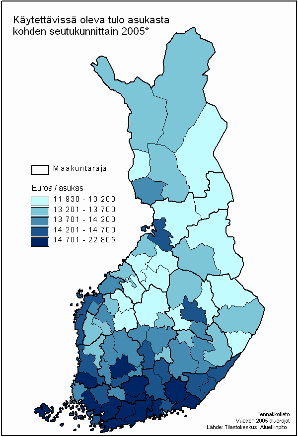 Käytettävissä oleva tulo asukasta kohden seutukunnittain 2005*, euroa