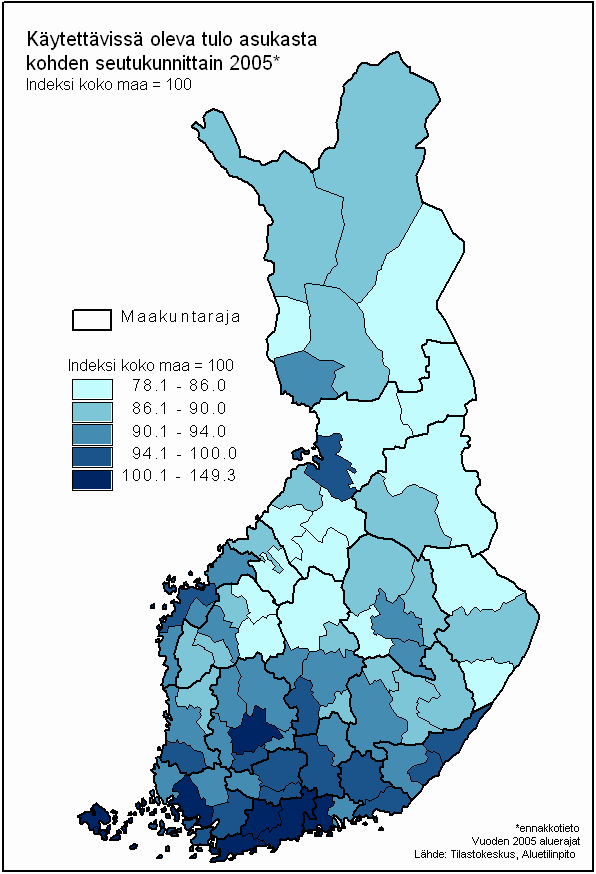 Käytettävissä oleva tulo asukasta kohden seutukunnittain 2005*, indeksi koko maa = 100