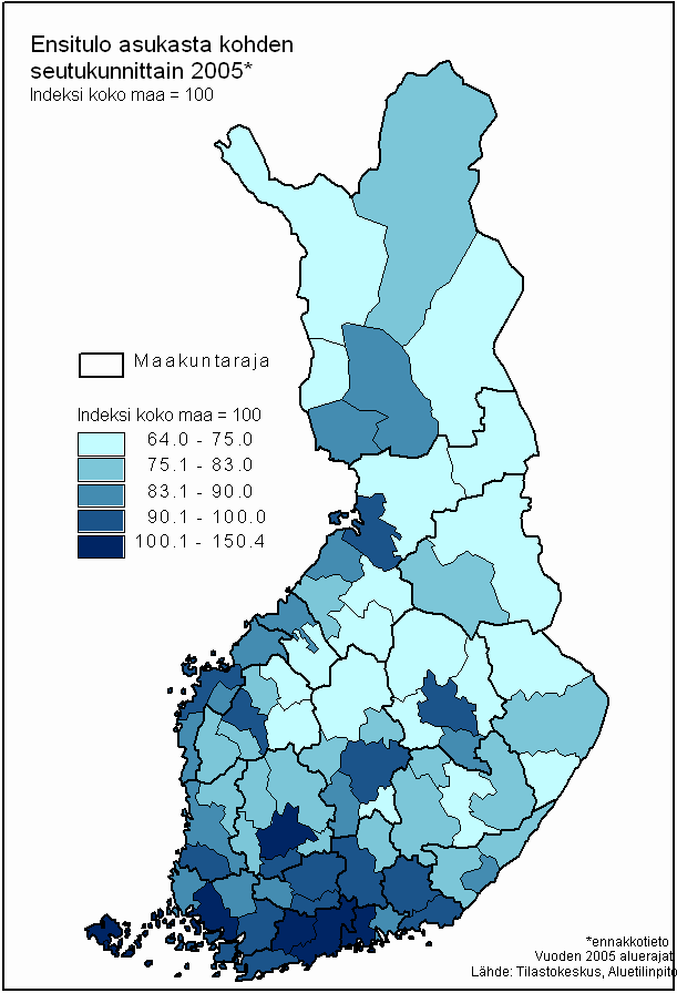 Ensitulo asukasta kohden seutukunnittain 2005*, indeksi koko maa = 100