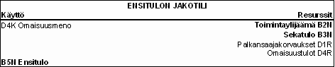 Tulojen uudelleenjaon tili alkaa ensitulolla, joka on siirretty ensitulon jakotilin käyttö puolelta tulojen uudelleenjakotilin avaavaksi resurssiksi. Tulojen uudelleenjaon jälkeen tili päättyy käytettävissä olevaan tuloon.