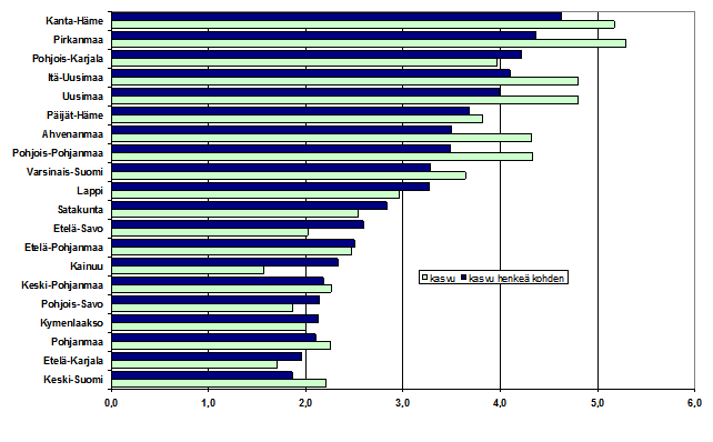 Kotitalouksien tulot kasvoivat nopeimmin Kanta-Hämeessä (4,6 %) ja Pirkanmaalla (4,4 %) vuonna 2005. Näiden lisäksi kuuden muun maakunnan ensitulo* henkeä kohden kasvoi koko maan keskiarvoa nopeammin. Kotitalouksien alueittaiset erot jatkoivat lievää kasvua toista vuotta peräkkäin. Vuosituhannen alussa hitaamman kehityksen aikana erot kaventuivat.