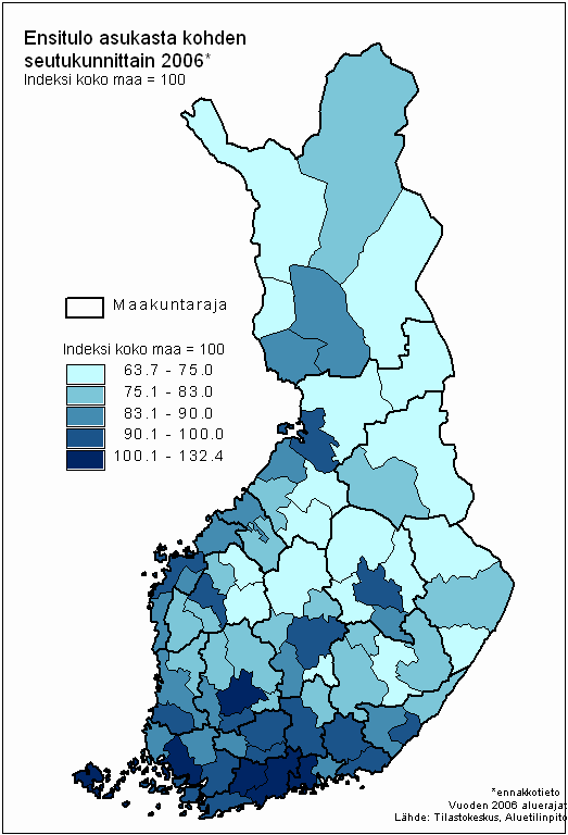 Ensitulo asukasta kohden seutukunnittain 2006*, indeksi koko maa = 100