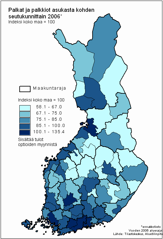 Palkat ja palkkiot asukasta kohden seutukunnittain 2006*, indeksi koko maa = 100
