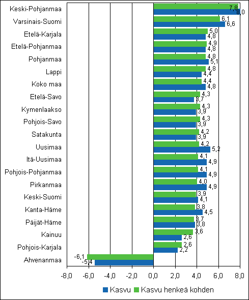 Koko maan keskiarvoa paremmin menestyneiden maakuntien kasvu johtui suurelta osin palkansaajakorvausten kasvusta, joka oli voimakkainta juuri Varsinais-Suomessa (5,1 %) ja Keski-Pohjanmaalla (5,0%). Myös Kanta-Hämeessä ja Etelä-Pohjanmaalla palkansaajakorvaukset kasvoivat 5,0 %. Ahvenanmaan heikkoa kehitystä selittävät yrittäjätulojen ja omaisuustulojen tippuminen edellisvuoden kovan nousun jälkeen.