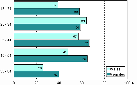 Women were more active in this respect than men and their activity did not decline with age in the same way. The peak participation rate for women occurred in the age range 35-54 years and that for men at 25-34 years. Participation was highest in the urban areas.