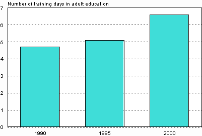 The increase in participation in adult education and training was also reflected in the number of days of attendance during the year. Where the figure in 1990 had been about nine days per head of population aged 18-64 years, it had risen to 11 days in 1995 and to 13 days by 2000.