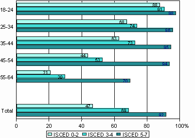 Use of a computer within the last year by age and highest level of educational attainment (population aged 18 - 64)