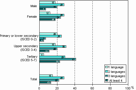 Four out of every five respondents aged 18-64 years claimed at least some knowledge of one or more foreign languages. Almost two thirds mentioned two languages, a third at least three and 13% at least four. The best knowledge was claimed by the young people, the women and those with the highest level of basic education.