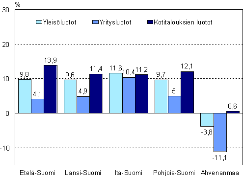 Suuralueista eniten yleisöluotot kasvoivat Itä-Suomessa, jossa luotot lisääntyivät vajaat 12 prosenttia. Etelä-, Länsi- ja Pohjois-Suomessa kasvu oli 10 prosenttia. Ahvenanmaalla yleisöluottokanta puolestaan laski lähes 4 prosenttia. Maakunnittain tarkasteltuna luotot lisääntyivät selvästi eniten Pohjois-Karjalassa, 16 prosenttia, ja Kanta-Hämeessä, 14 prosenttia.