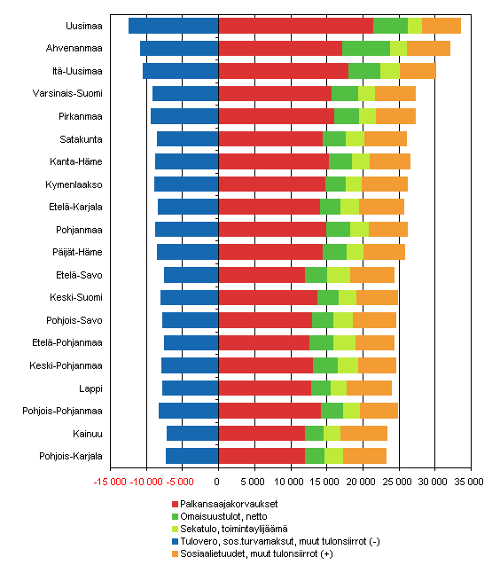 Uudenmaan kotitalouksilla on käytössään eniten tuloja. Kun uusimaalaisten kotitalouksien saamista palkoista ja muista palkansaajakorvauksista, omaisuus- ja muista tulosta sekä sosiaalietuuksista vähennetään maksetut tuloverot, sosiaaliturvamaksut ja muut maksetut tulonsiirrot, jää Uudellamaalla asuvan kulutukseen ja säästämiseen käytettäväksi tuloksi 19.700 euroa. Koko maassa tuloa asukasta kohti kertyy keskimäärin 17.000 euroa. Myös Ahvenanmaan ja Itä-Uudenmaan käytettävissä olevat tulot ylittävät koko maan keskiarvon.