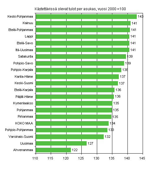 Ahvenanmaalla käytettävissä olevat tulot asukasta kohti ovat kasvaneet vuosien 2000 ja 2007 välisenä aikana runsaan viidenneksen ja Uudellamaalla neljänneksen. Edellisten lisäksi myös Varsinais-Suomen ja Pohjois-Pohjanmaan tulojen kasvuvauhti on ollut hitaampaa kuin koko maassa keskimäärin. Käytettävissä olevat tulot asukasta kohden ovat alueellisesti hieman tasoittuneet.