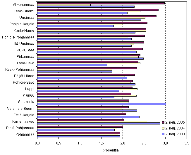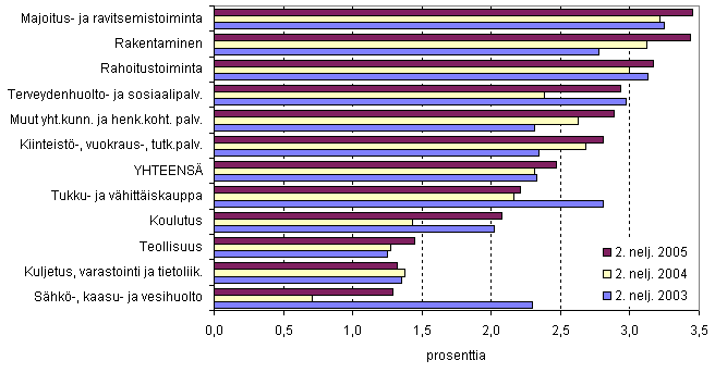 Vuoden 2005 toisella neljänneksellä uusia yrityksiä suhteessa yrityskantaan perustettiin keskimäärin 2,5 prosenttia. Eniten yrityksiä perustettiin majoitus- ja ravitsemistoiminnan ja rakentamisen toimialoilla, molemmissa 3,4 prosenttia. Uusia yrityksiä suhteessa yrityskantaan perustettiin sekä vuoden 2003 että 2004 toisella neljänneksellä keskimäärin 2,3 prosenttia.