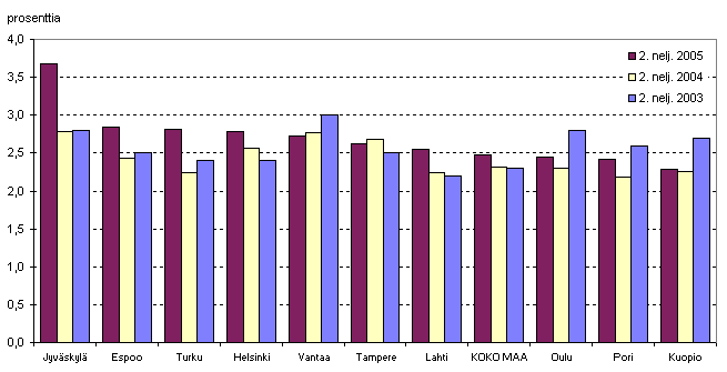 Kuvio 3. Aloittaneet yritykset suhteessa yrityskantaan kunnittain, 2. neljännes 2003 - 2005; mukana 10 kuntaa, joissa lukumääräisesti eniten aloittaneita yrityksiä.