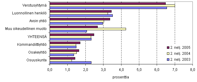 Vuoden 2005 toisella neljänneksellä aloitti eniten luonnollisia henkilöitä eli liikkeen- tai ammatinharjoittajayrityksiä (3 633), toiseksi eniten osakeyhtiöitä (1 835) ja kolmanneksi kommandiittiyhtiöitä (425). Luonnollisten henkilöiden osuus aloittaneiden yritysten kokonaismäärästä oli 57,1 prosenttia, osakeyhtiömuotoisten osuus 28,8 prosenttia ja kommandiittiyhtiöiden osuus 6,7 prosenttia.