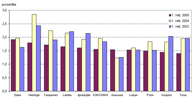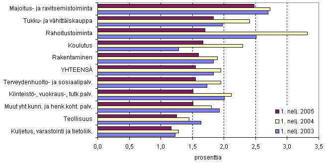 Yrityksiä lopetettiin suhteessa yrityskantaan vuoden 2005 ensimmäisellä neljänneksellä keskimäärin 1,5 prosenttia. Eniten yrityksiä lopetettiin majoitus- ja ravitsemistoiminnan toimialalla (2,5 %). Vuoden 2004 ensimmäisellä neljänneksellä yrityksiä lopetettiin keskimäärin 2,0 prosenttia ja vuonna 2003 keskimäärin 1,8 prosenttia.