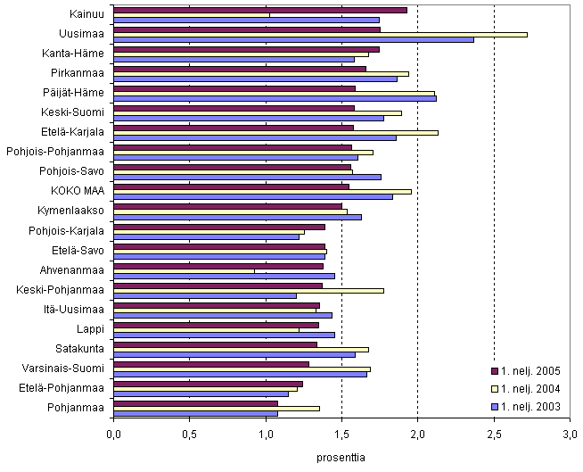 Vuoden 2005 ensimmäisellä neljänneksellä yrityksiä lopetettiin eniten Uudellamaalla (1 310), Pirkanmaalla (368) ja Varsinais-Suomessa (301). Suhteessa yrityskantaan yrityksiä lopetettiin vilkkaimmin Kainuussa (1,9 %), Uudellamaalla (1,8 %) sekä Kanta-Hämeessä ja Pirkanmaalla, molemmissa 1,7 prosenttia. Vuoden 2004 ensimmäisellä neljänneksellä suhteessa yrityskantaan yrityksiä lopetettiin eniten Uudellamaalla (2,7 %) ja vuonna 2003 eniten yrityksiä lopetettiin myös Uudellamaalla (2,4 %).
