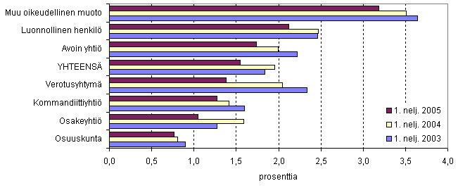 Vuoden 2005 ensimmäisellä neljänneksellä lopetti eniten luonnollisia henkilöitä eli liikkeen- tai ammatinharjoittajayrityksiä (2 177), toiseksi eniten osakeyhtiöitä (1 165) ja kolmanneksi kommandiittiyhtiöitä (315). Luonnollisten henkilöiden osuus lopettaneiden yritysten kokonaismäärästä oli 55,4 prosenttia, osakeyhtiömuotoisten osuus 29,7 prosenttia ja kommandiittiyhtiöiden osuus 8,0 prosenttia.