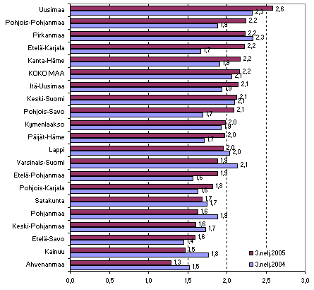 Vuoden 2005 kolmannella neljänneksellä uusia yrityksiä suhteessa yrityskantaan perustettiin keskimäärin 2,2 prosenttia. Eniten yrityksiä aloitettiin terveydenhuolto- ja sosiaalipalveluissa (3,0 %) sekä majoitus- ja ravitsemistoiminnassa ja muissa yhteiskunnallisissa ja henkilökohtaisissa palveluissa, molemmissa 2,7 %.