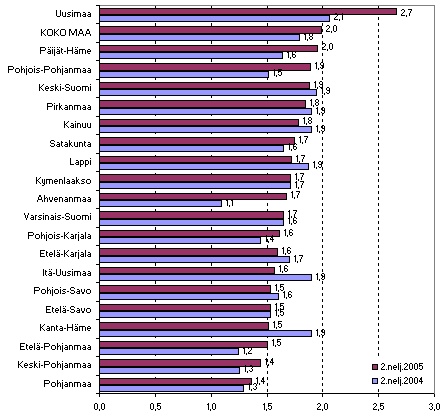 Yrityksiä lopetti vuoden 2005 toisella neljänneksellä eniten Uudellamaalla (2 031), Pirkanmaalla (416) ja Varsinais-Suomessa (396). Suhteessa yrityskantaan yrityksiä lopetettiin vilkkaimmin Uudellamaalla (2,7 %) ja Päijät-Hämeessä (2,0 %).