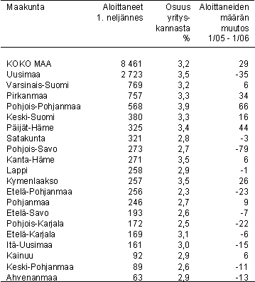 Vuoden 2006 ensimmäisellä neljänneksellä lukumääräisesti eniten yrityksiä aloitti Uudellamaalla (2 723). Runsaasti aloituksia oli myös Varsinais-Suomessa (769), Pirkanmaalla (757) ja Pohjois-Pohjanmaalla (568). Yrityskantaan suhteutettuna eniten aloittaneita yrityksiä oli Pohjois-Pohjanmaalla (3,9 %), Kanta-Hämeessä (3,5 %), Uudellamaalla (3,5 %) ja Kymenlaaksossa (3,5 %).