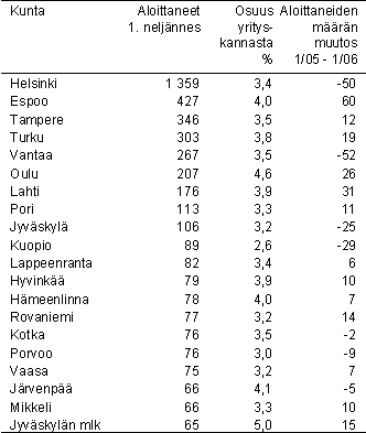 Vuoden 2006 ensimmäisellä neljänneksellä eniten aloittaneita yrityksiä oli Helsingissä (1 359), Espoossa (427), Tampereella (346) ja Turussa (303). Verrattuna edellisen vuoden ensimmäiseen neljännekseen aloittaneiden yritysten määrä lisääntyi eniten Espoossa (+60) ja Lahdessa (+31). Edellisen vuoden ensimmäiseen neljännekseen verrattuna aloittaneiden yritysten määrä väheni eniten Vantaalla (-52) ja Helsingissä (-50).