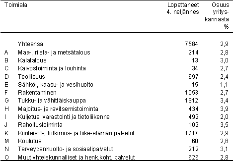 Tilastokeskuksen mukaan vuoden 2005 viimeisellä neljänneksellä toimintansa lopetti 7 584 yritystä. Edellisen vuoden viimeiseen neljännekseen verrattuna lopettaneiden yritysten määrä on laskenut lievästi, kun vuoden 2004 viimeisellä neljänneksellä toimintansa lopetti 7 843 yritystä. Eniten lopettaneita yrityksiä oli kaupan toimialalla, jossa lopettaneita yrityksiä oli 1 912. Lopettaneita yrityksiä oli runsaasti myös kiinteistö- ja liike-elämän palveluissa (1 717) ja rakentamisen toimialalla (1 053).