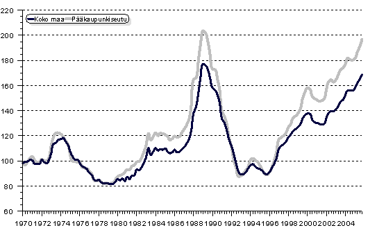 På årsnivå steg priserna på gamla höghusbostäder i hela landet med i genomsnitt 9,0 procent. Inom huvudstadsregionen steg priserna med 10,2 procent och i övriga Finland med 7,9 procent. Enligt förhandsuppgifterna gjordes omkring 68 000 bostadsaffärer år 2005, vilket är omkring 9 procent mer än år 2004.
