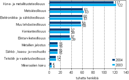 Palkatun henkilöstön määrä koko teollisuudessa vuosina 2003 ja 2004 (1000 henkilöä)