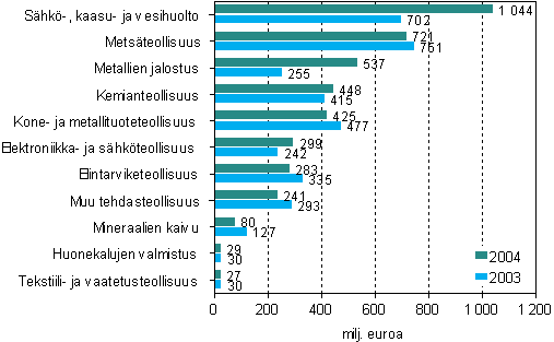 Tehdasteollisuudessa investoinnit kasvoivat huomattavasti metallien jalostuksessa, yli 110 prosenttia ja elektroniikka- ja sähköteollisuudessa, runsaat 23 prosenttia. Kemianteollisuudessa investoinnit lisääntyivät 8 prosenttia vuoteen 2003 verrattuna. Voimakkaimmin investoinnit sen sijaan laskivat muussa tehdasteollisuudessa, lähes 18 prosenttia, elintarviketeollisuudessa, vajaat 16 prosenttia, tekstiili- ja vaatetusteollisuudessa, lähes 12 prosenttia sekä kone- ja metallituoteteollisuudessa, lähes 11 prosenttia. Metsäteollisuuden investoinnit supistuivat yli 4 prosenttia edellisvuodesta.